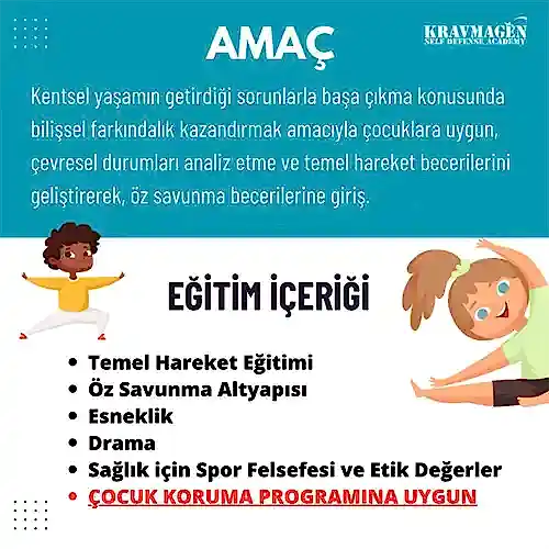 Çocuk Koruma Programı'na uygun olarak tasarlanan Krav Magen Spor Okulu, 5-12 yaş aralığı çocuklar için hazırlanmıştır.
